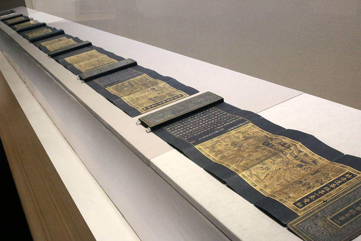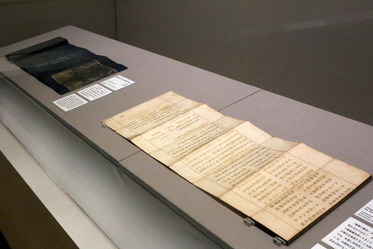 (左奥から)《紺紙銀字大方広仏華厳経 卷第七》14世紀 根津美術館蔵 / 《白紙金字大方広仏華厳経 普賢行願品》14世紀 京都国立博物館蔵