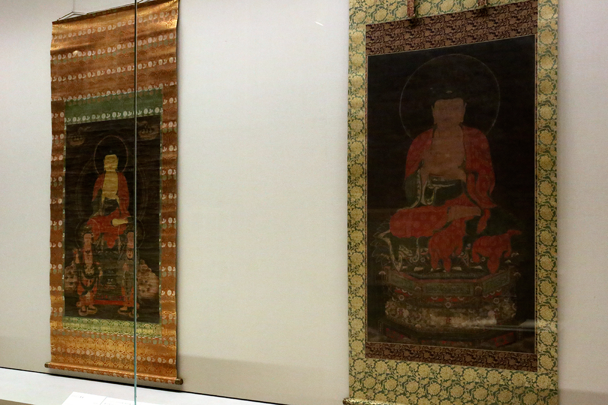 (左奥から)重要文化財《阿弥陀三尊・二比丘像》1330年(至順元年・忠粛王17年) 埼玉・法恩寺蔵 / 重要文化財《帝釈天像 (摩利支天像)》13~14世紀 京都・聖澤院蔵