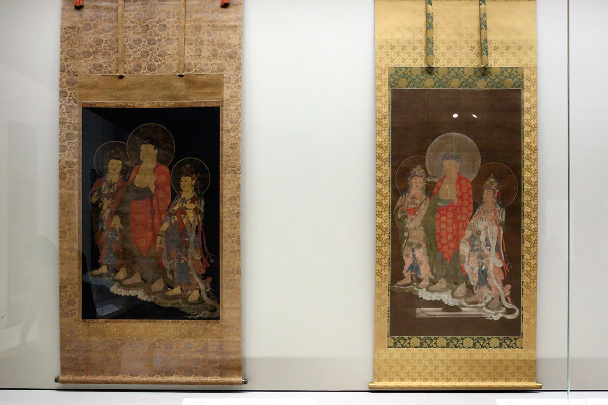 (左から)《阿弥陀三尊像》14世紀 泉屋博古館蔵 / 堺市指定文化財《阿弥陀三尊像》13~14世紀 大阪・法道寺蔵