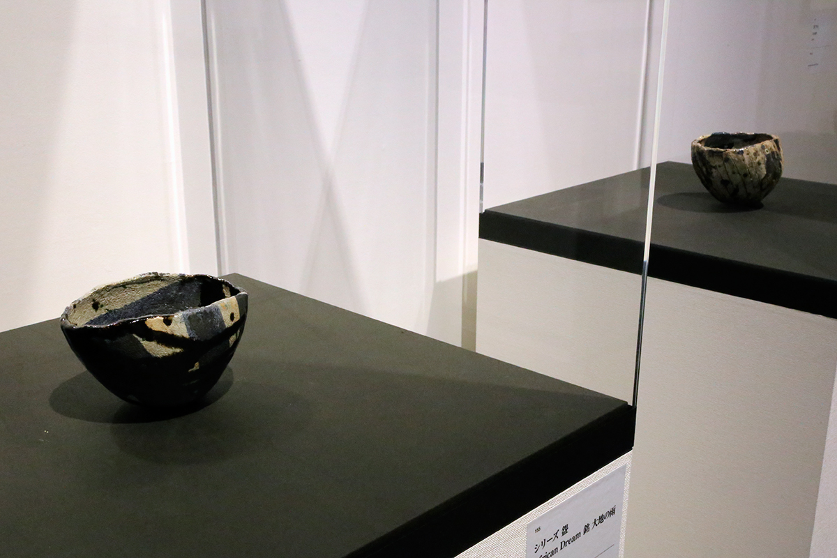 (手前)《焼貫黒樂茶碗 銘 涔雲は風を涵して谷間を巡る 悠々雲は濃藍の洸気を集めて浮上し》十五代 吉左衞門 2003年 樂美術館蔵