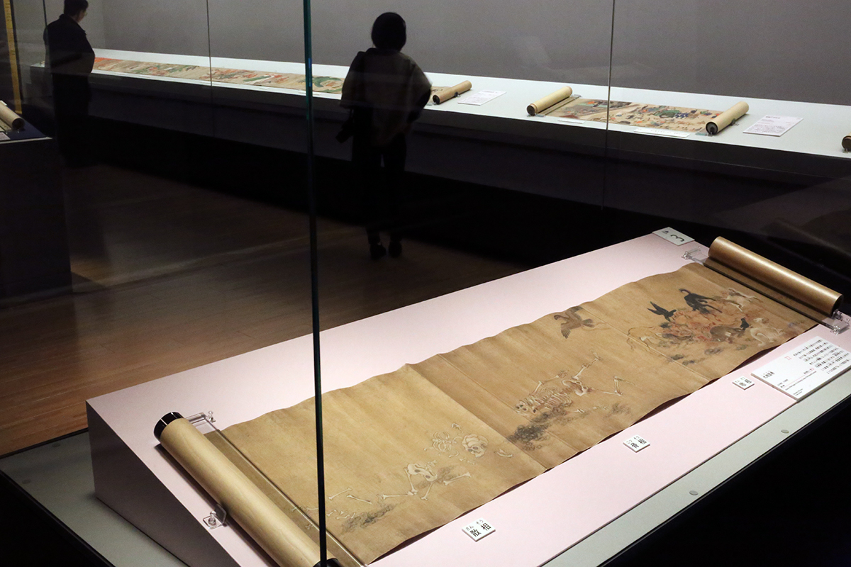 (手前)《九相図巻》個人蔵[展示期間 3/29~4/17] / (右奥)重要文化財《駒競行幸絵巻》和泉市久保惣記念美術館[展示期間 3/29~4/10]