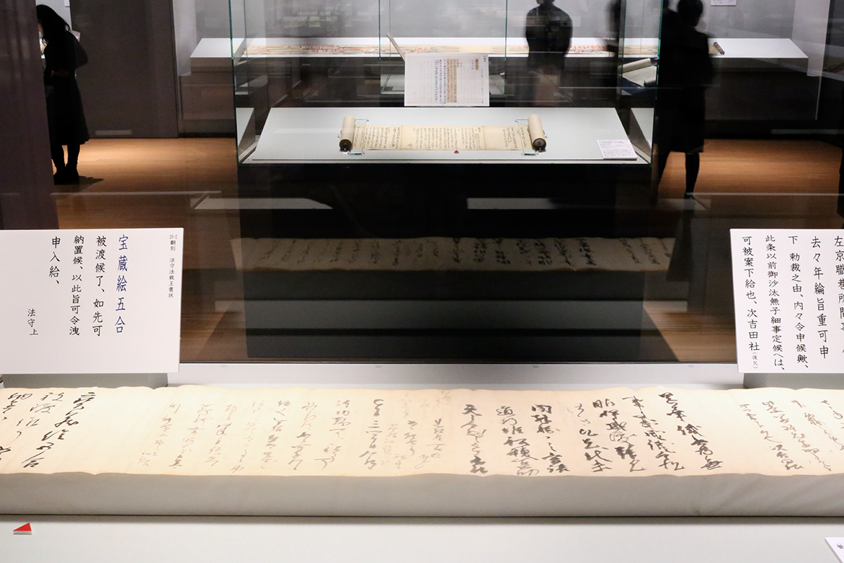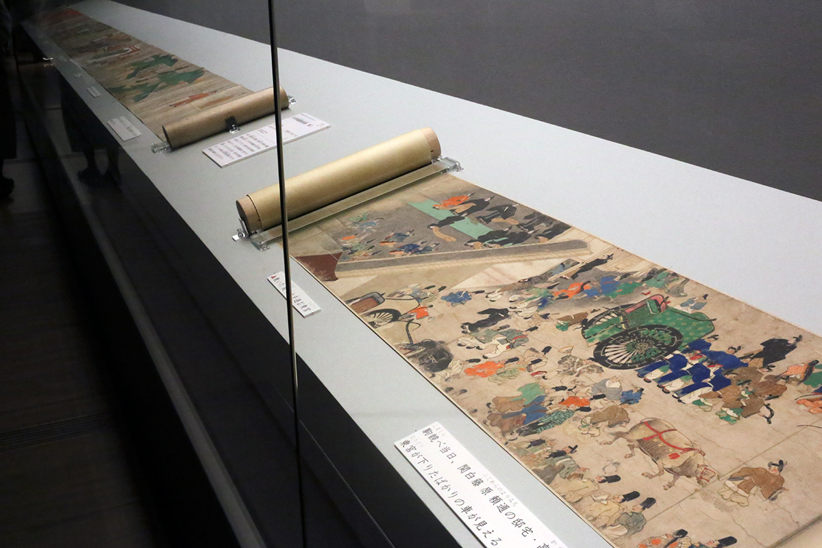 (左奥から)重要文化財《矢田地蔵縁起絵巻》京都・矢田寺[全期間展示] / 重要文化財《駒競行幸絵巻》和泉市久保惣記念美術館[展示期間 3/29~4/10]