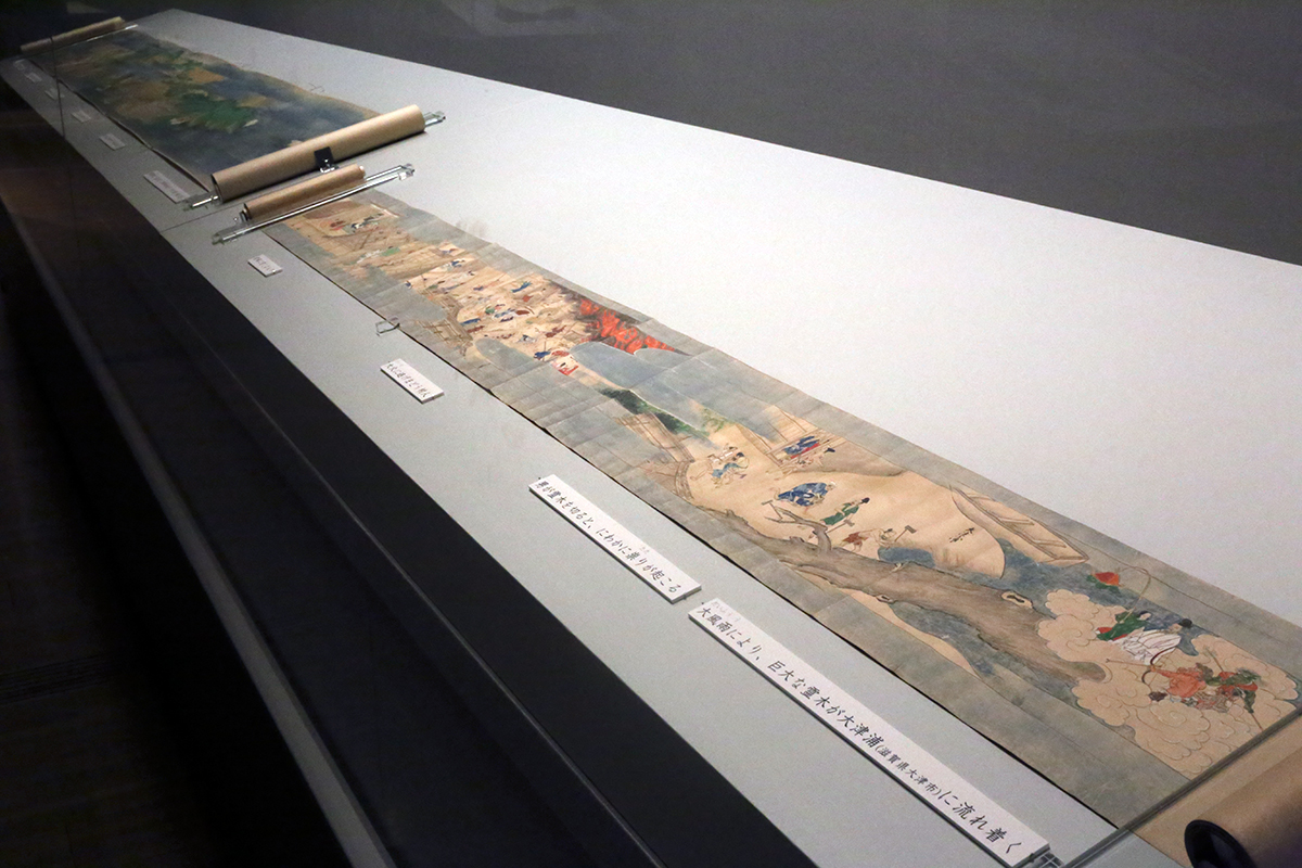 (左奥から)重要文化財《桑実寺縁起絵巻 巻下》滋賀・桑實寺[全期間展示] / 県指定文化財《長谷寺縁起絵巻 巻二》奈良・長谷寺[展示期間 3/29~4/17]