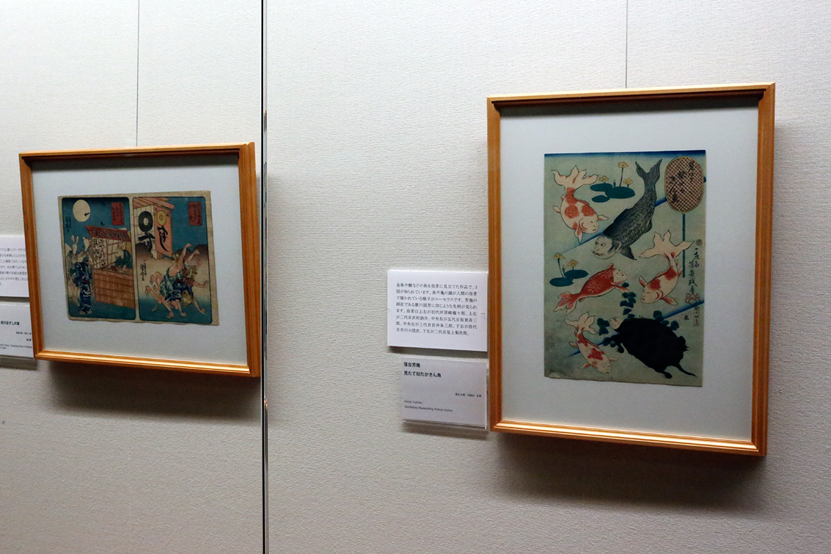 (左から)歌川国芳《道化十二支 卯のだんごや 蛇の目ずしの寅》 / 落合芳幾《見たて似たかきん魚》