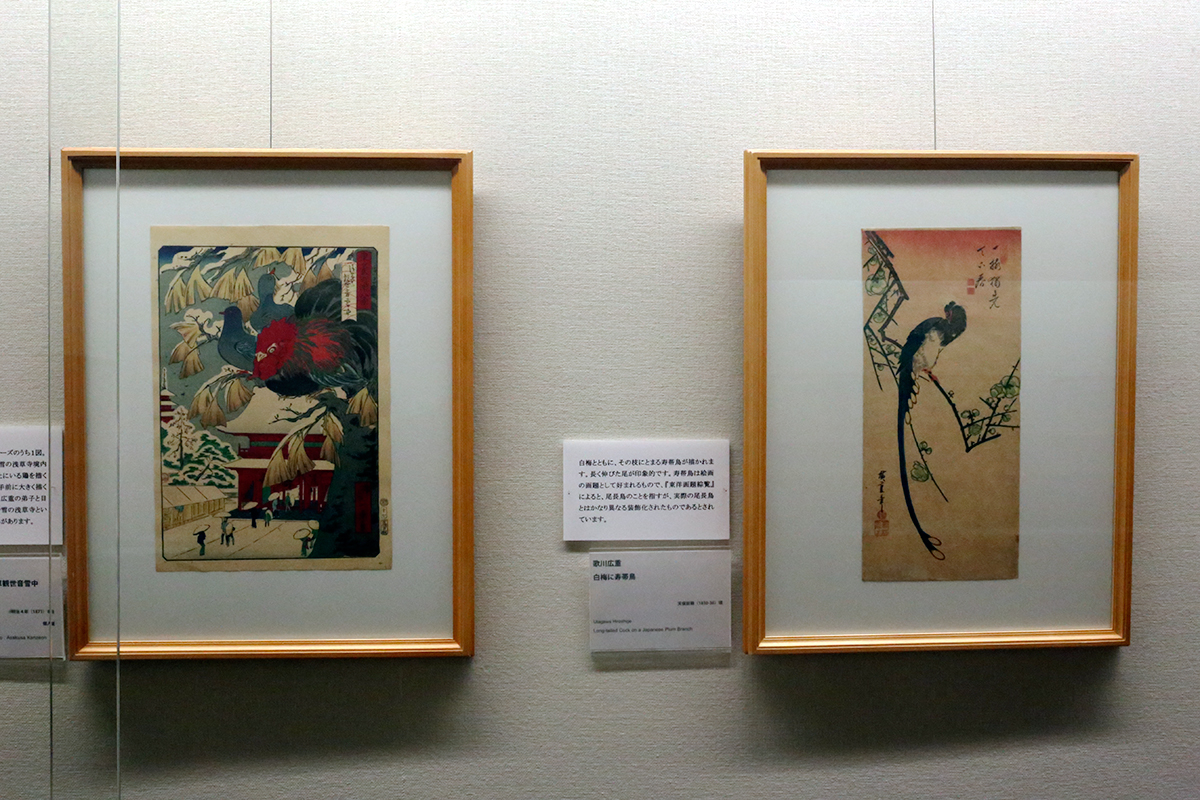 (左から)昇斎一景《東京名所四十八景 浅草観世音雪中》 / 歌川広重《白梅に寿帯鳥》