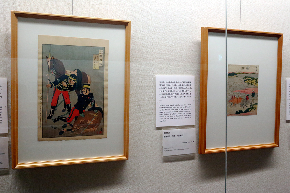 (左から)小林清親《陸海軍人高名鑑 浅川大尉二等兵木村源松氏》 / 葛飾北斎《東海道五十三次 七 藤沢》