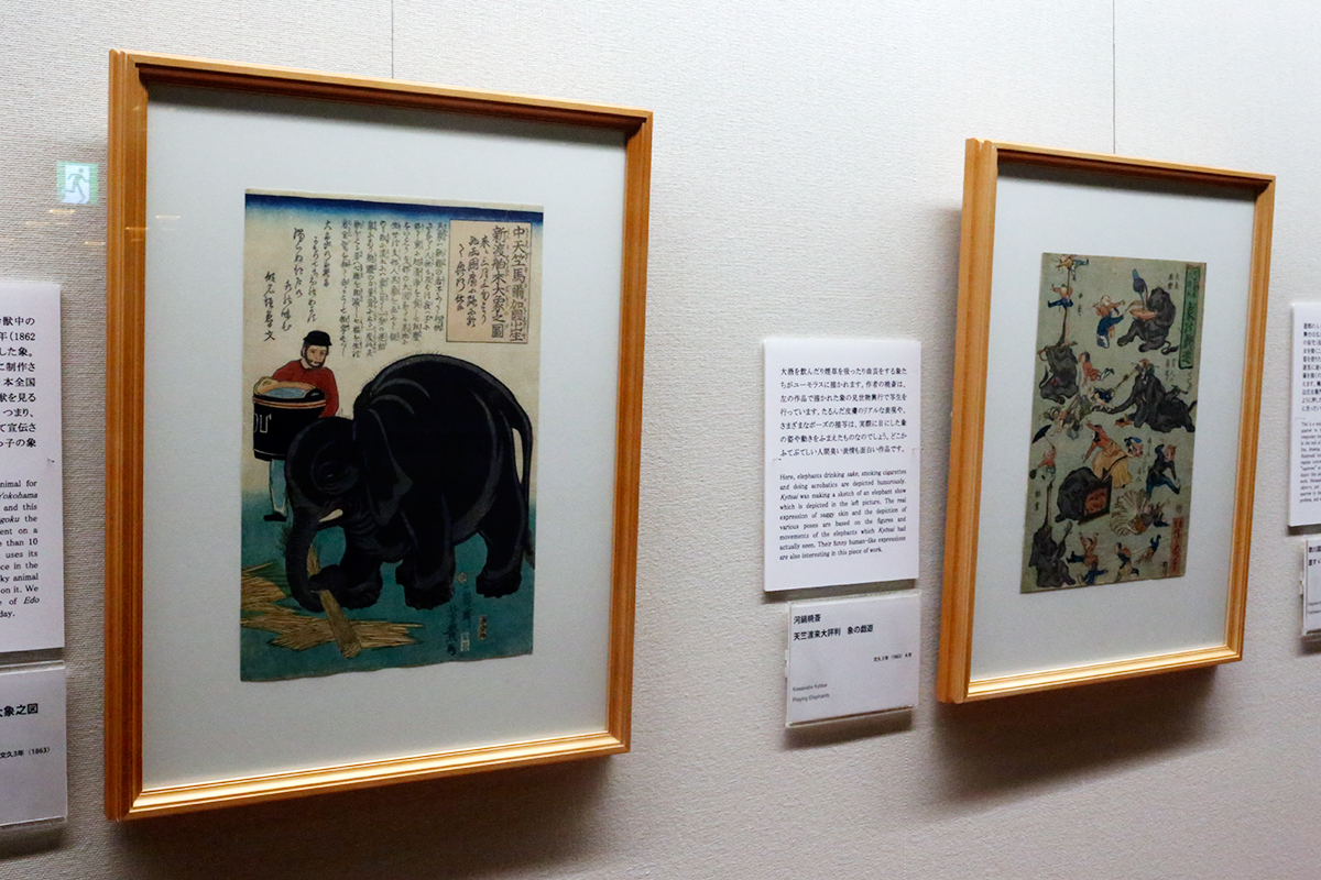 (左から)歌川芳豊《中天竺馬爾加国出生新渡舶来大象之図》 / 河鍋暁斎《天竺渡来大評判 象の遊戯》