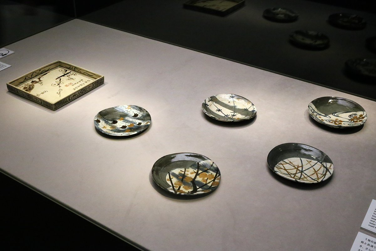 (左奥)《銹絵梅図角皿》尾形乾山作・尾形光琳画 / (右手前)重要文化財《銹絵染付金彩絵替土器皿》尾形乾山作
