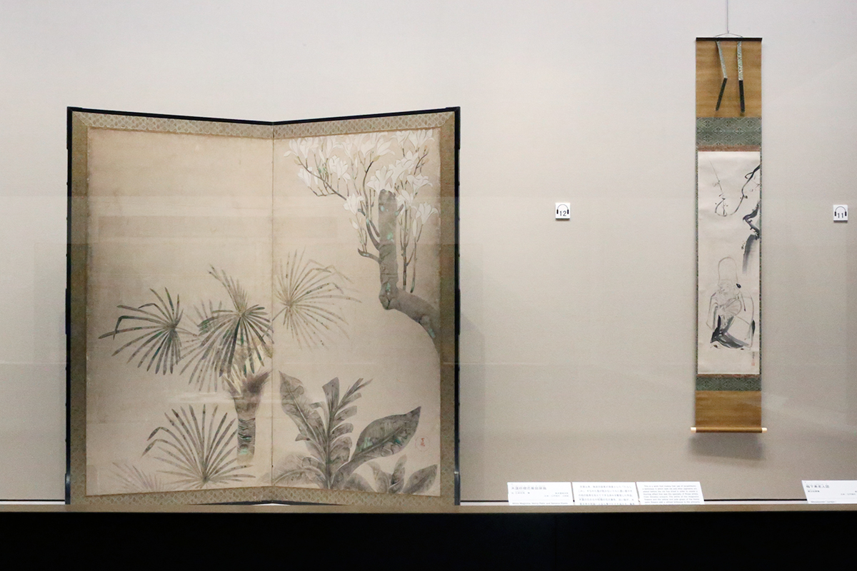 (左から)《木蓮棕櫚芭蕉図屏風》伝 立林何帠筆 / 《梅下寿老人図》渡辺始興筆