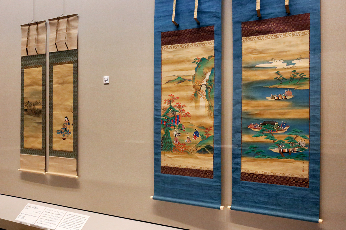 (左奥から)《高尾大夫・吉原通船図》歌川広重筆 / 《舟遊・紅葉狩図》住吉広定筆
