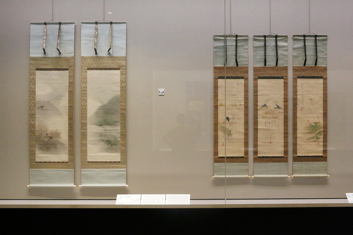 (左から)《不忍蓮・枯野牧童図》渡辺省亭筆 / 《富士・青田鷺・稲架烏図》野崎真一筆