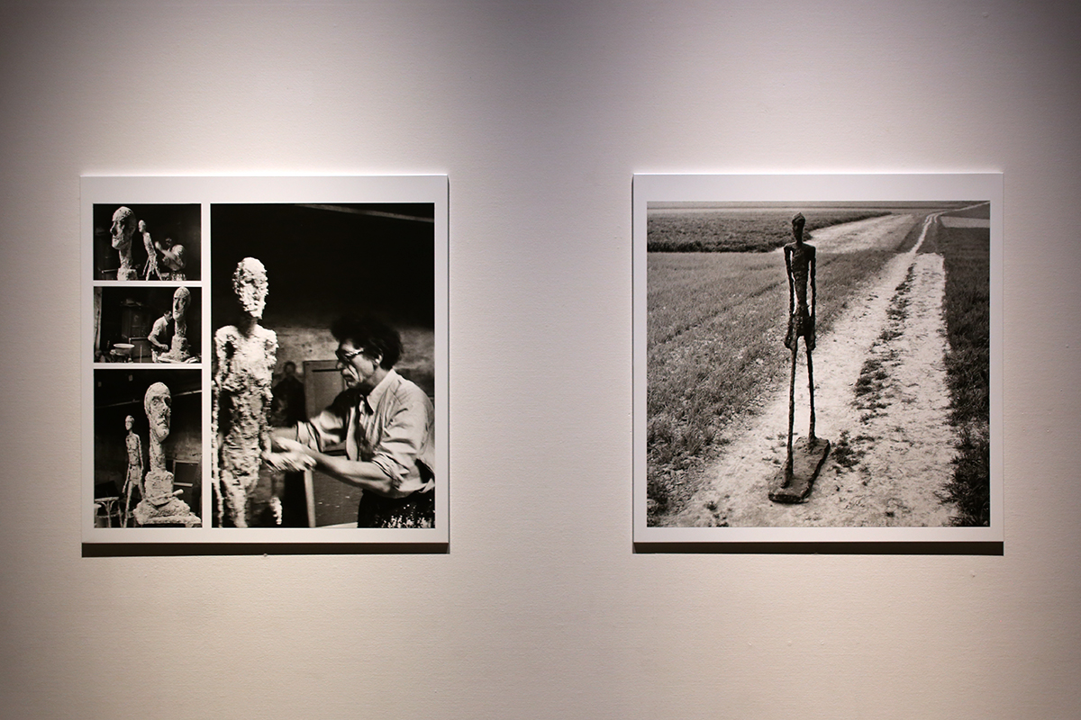 (左写真)アトリエにて《歩く男》を制作するジャコメッティ 1959年 エルンスト・シャイデッガー撮影 *展示室内の風景