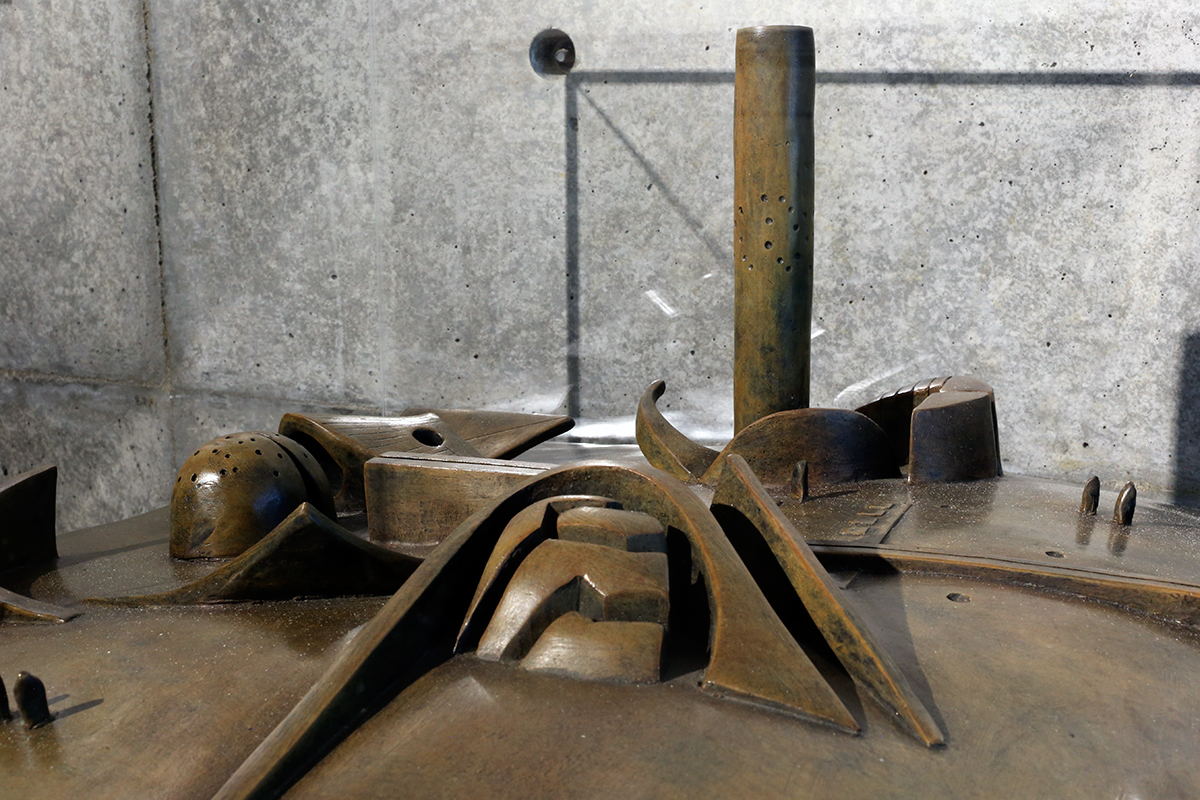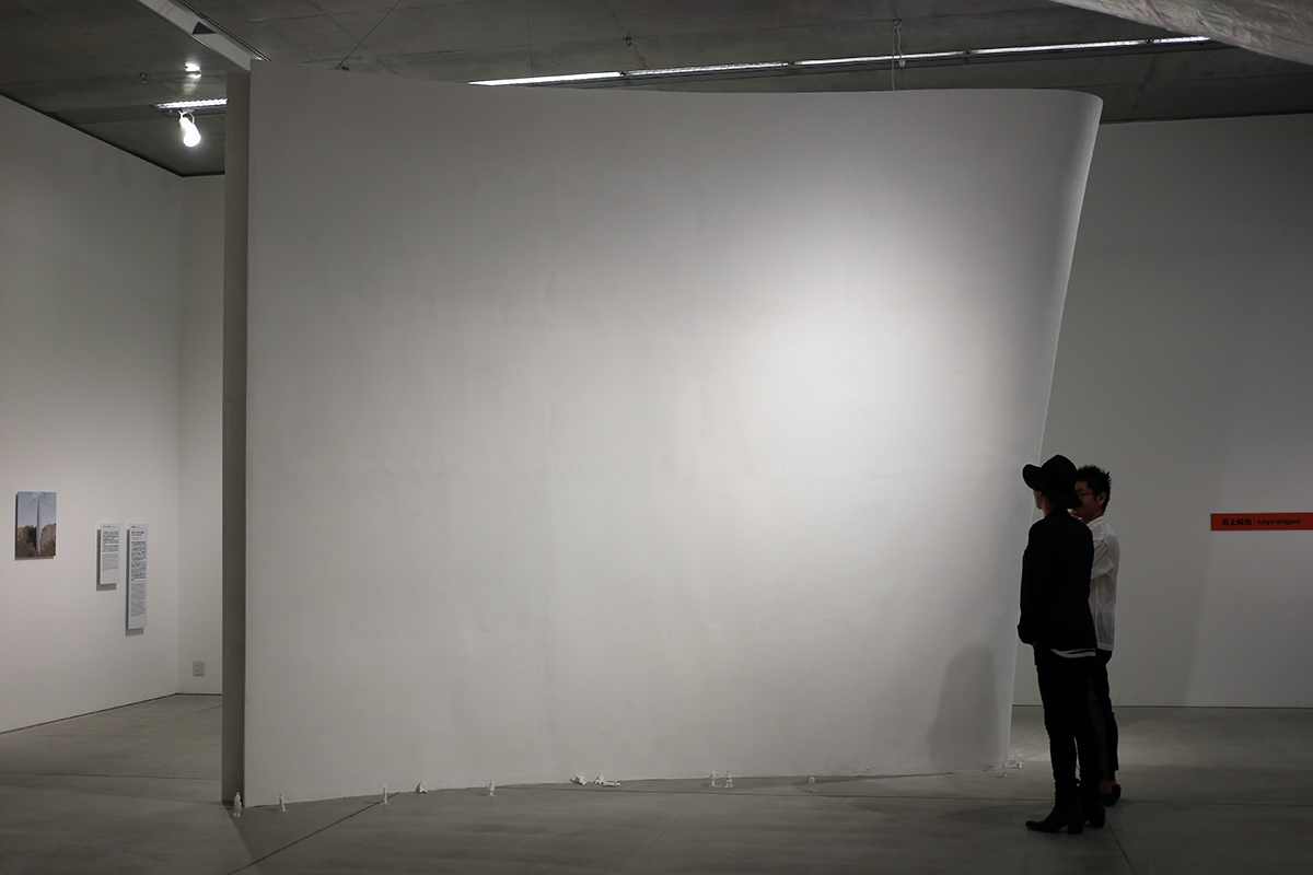 クリストとジャンヌ=クロード展示室にそびえ立つ、白い壁のような構造物。良く見ると、下部に人間の模型。実は10分の1スケールの建築模型で、石上純也さんが設計した教会のプランです。