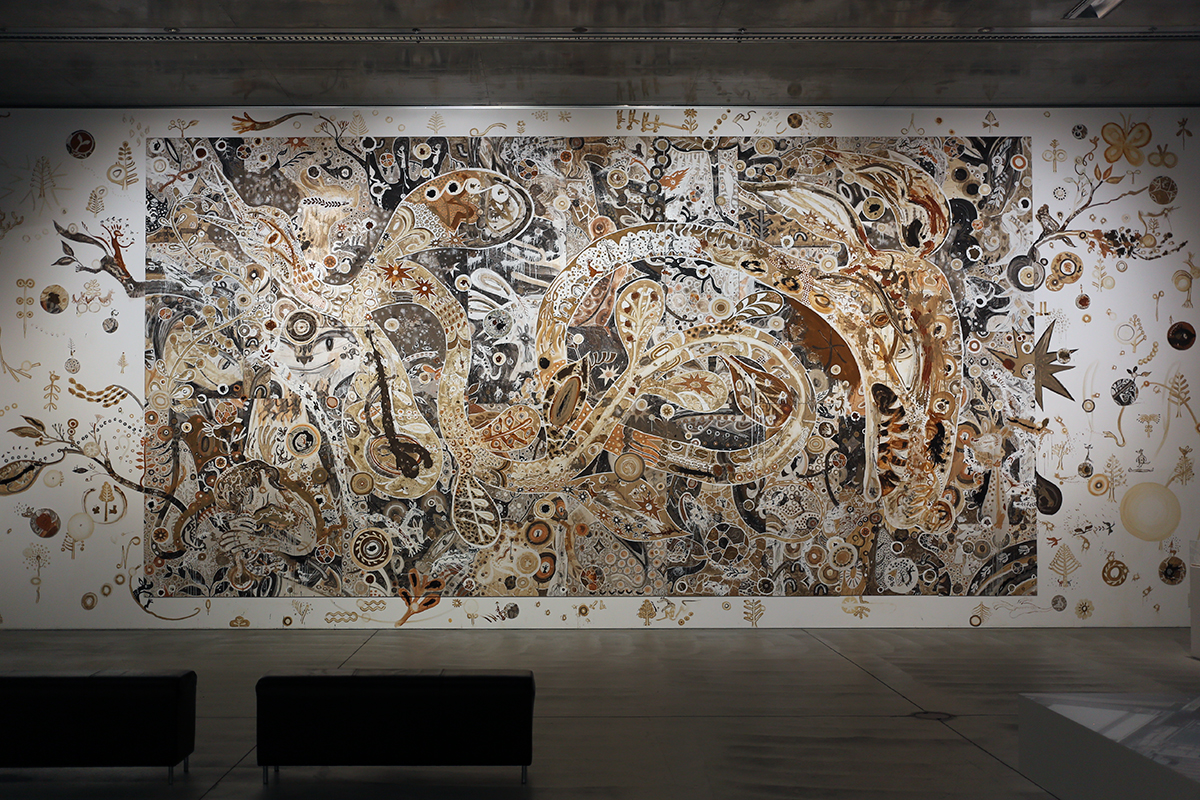 会場では創作過程のドキュメント映像などを紹介。さらに現在進行中の「マスタバ、アラブ首長国連邦のプロジェクト」のドローイング類も展示されています。