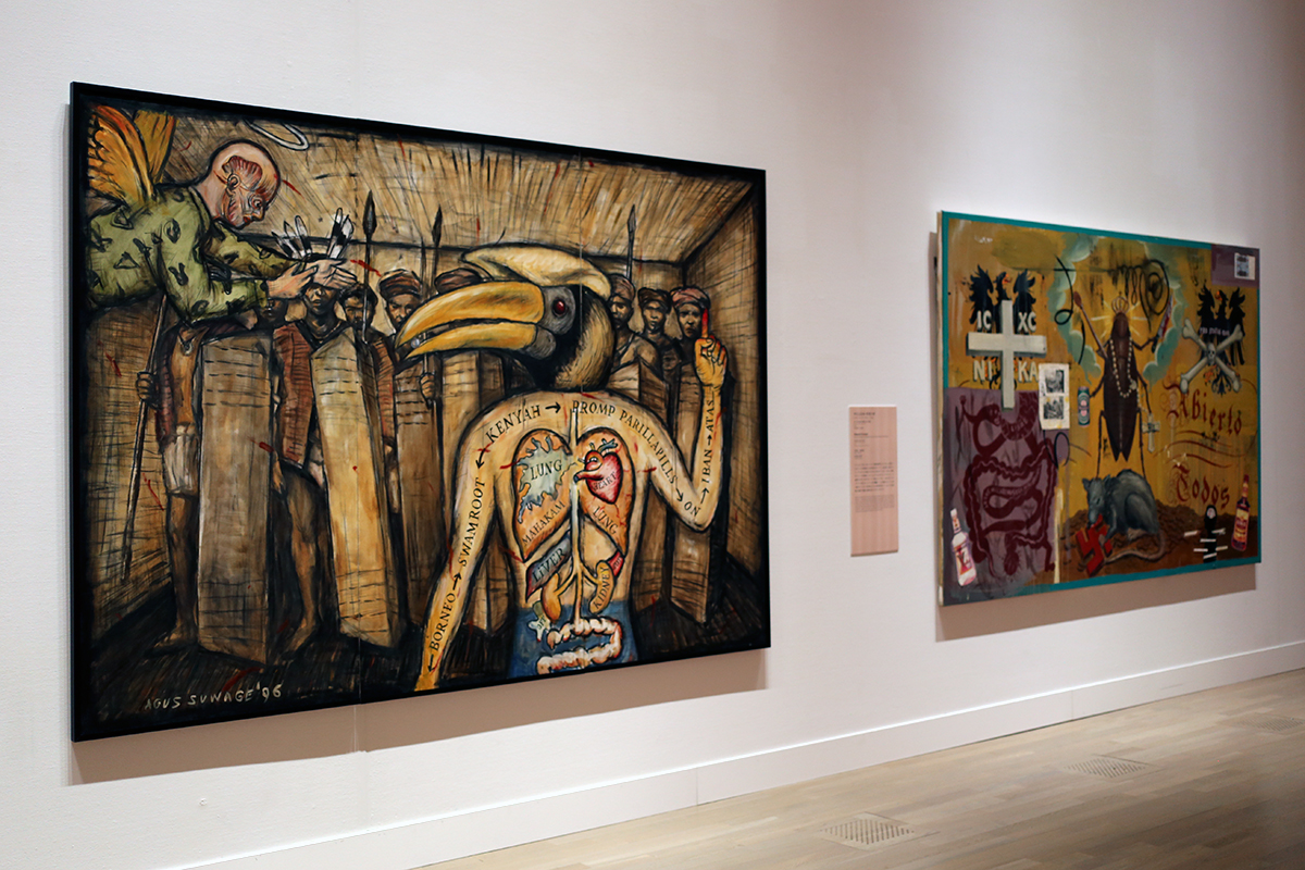 (左から)アグス・スワゲ(インドネシア)《サイチョウと宣教師》1996年 / マニュエル・オカンポ(フィリピン)《すべてのものに開かれた天国》1994年 ともに展示:国立新美術館