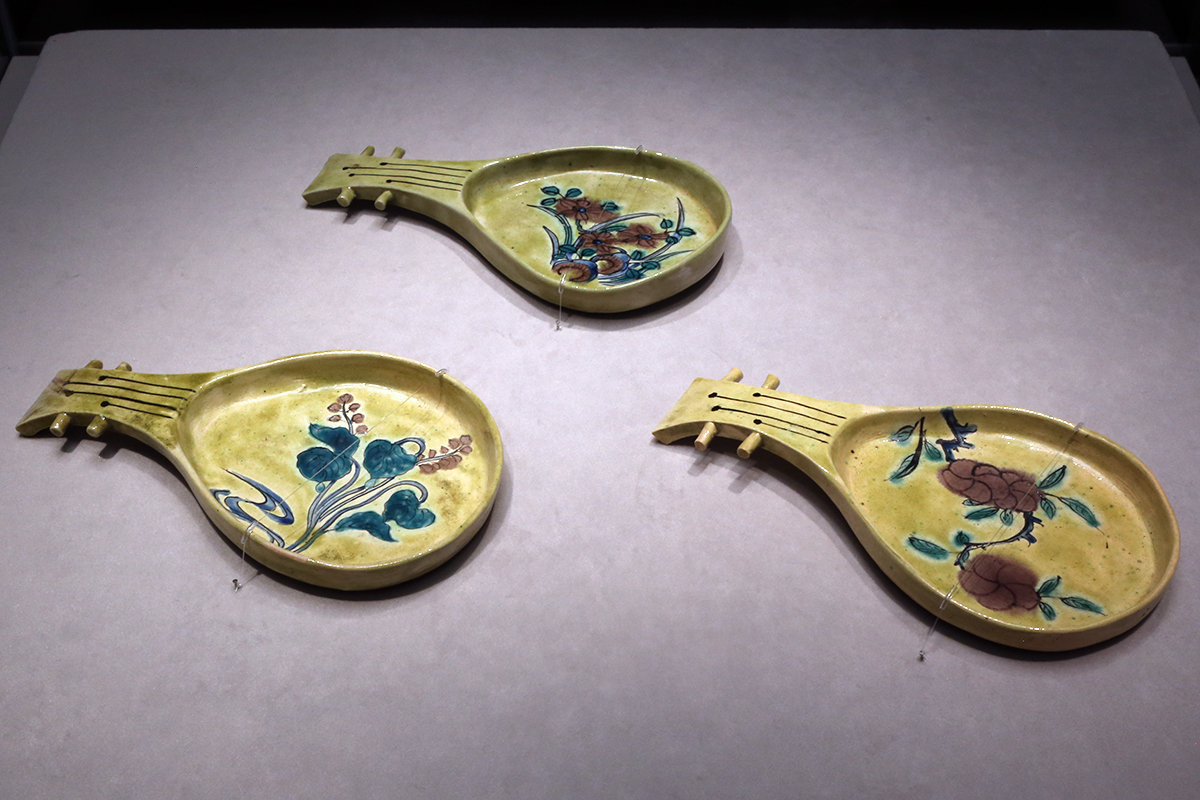 (左奥から)《三彩四葉形皿》鞏県窯 唐時代 / 《三彩宝相華鳥文皿》鞏県窯 唐時代