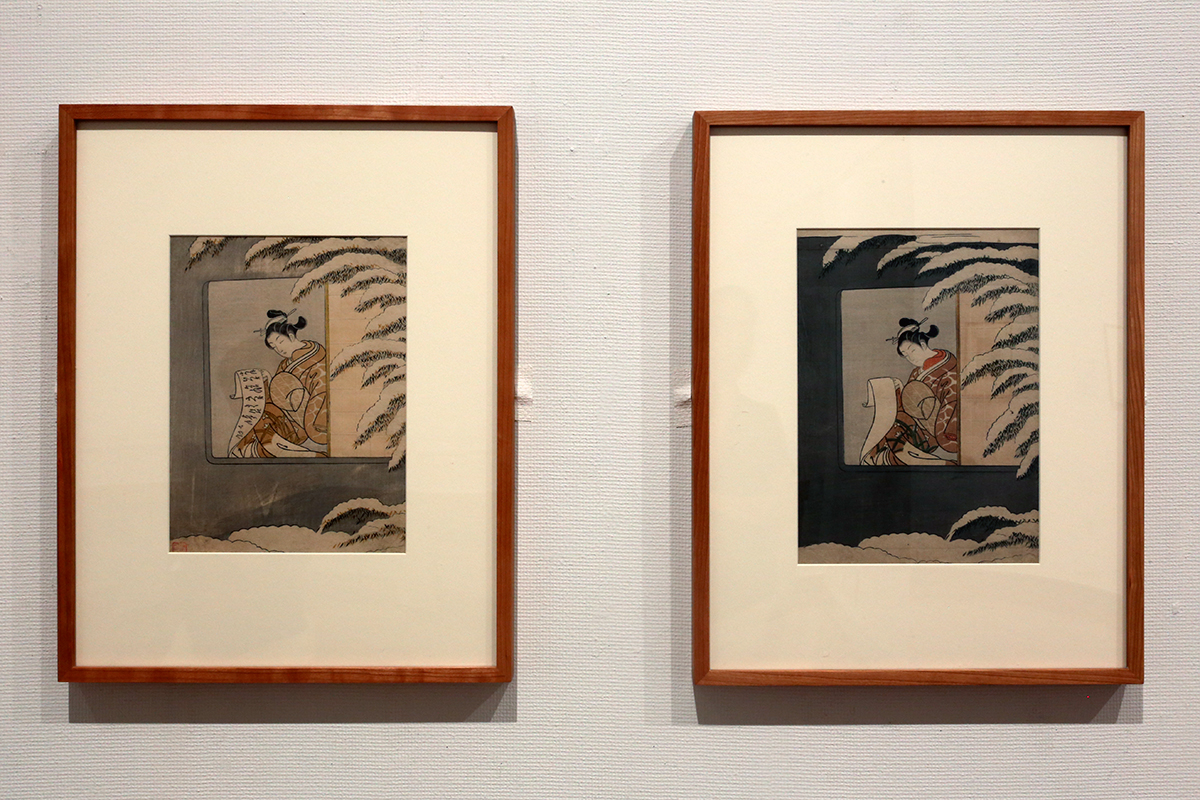 (左から)鈴木春信《見立孫康》明和2年(1765)絵暦 中判摺物 / 鈴木春信《見立孫康》もと明和2年(1765)絵暦 中判錦絵
