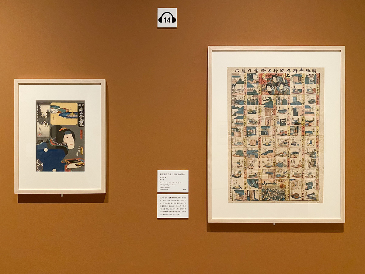 ここには歌舞伎の浮世絵も。芝居小屋の風景から役者の姿まで、歌舞伎は数多く浮世絵に描かれており、なかには宴席の料理なども添えられました。