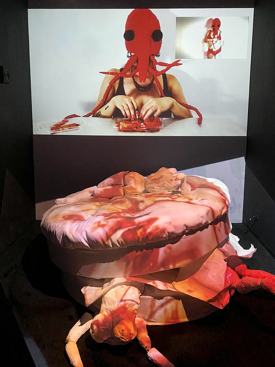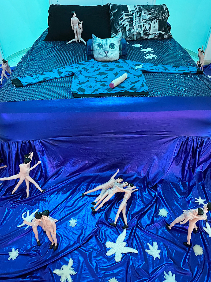 フィリピン出身のラス・リグタス(1985-)の作品は、性がテーマ。海を思わせる青いシーツのベッドにはヒトテのオブジェとアダルトグッズ、そして裸の人形たち。作者は自身のオルター・エゴ(=分身)である複数のキャラクターによるパフォーマンスも行っています。