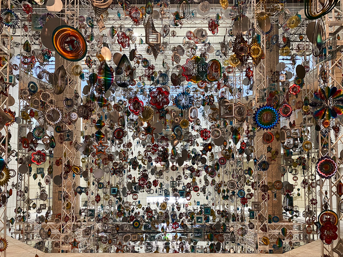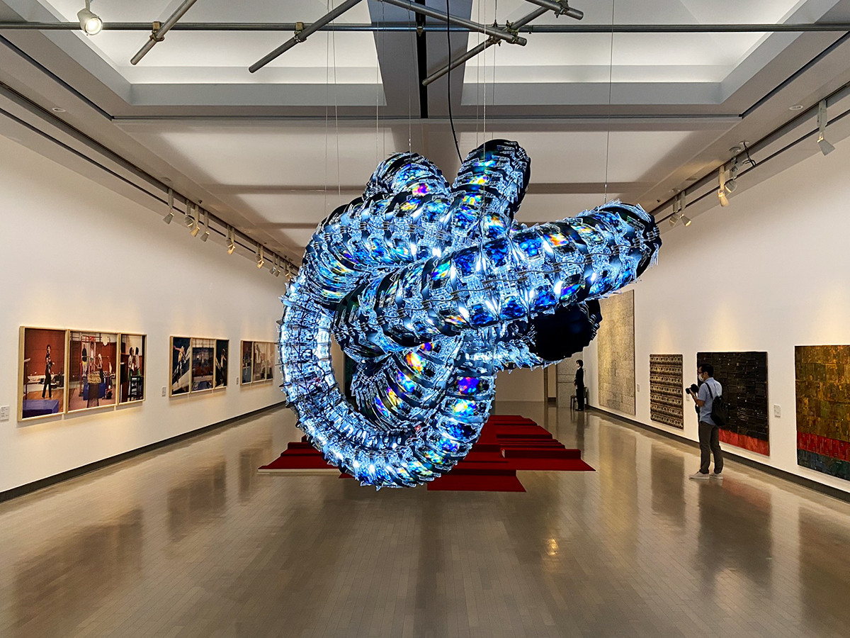 美術館のエントランスは、キラキラと輝く無数の金属板の森。「AFTERGLOW ― 光の破片をつかまえる」のタイトルを体言するかのような作品は、丹下健三が設計した美術館の広い空間をうまく利用しています。