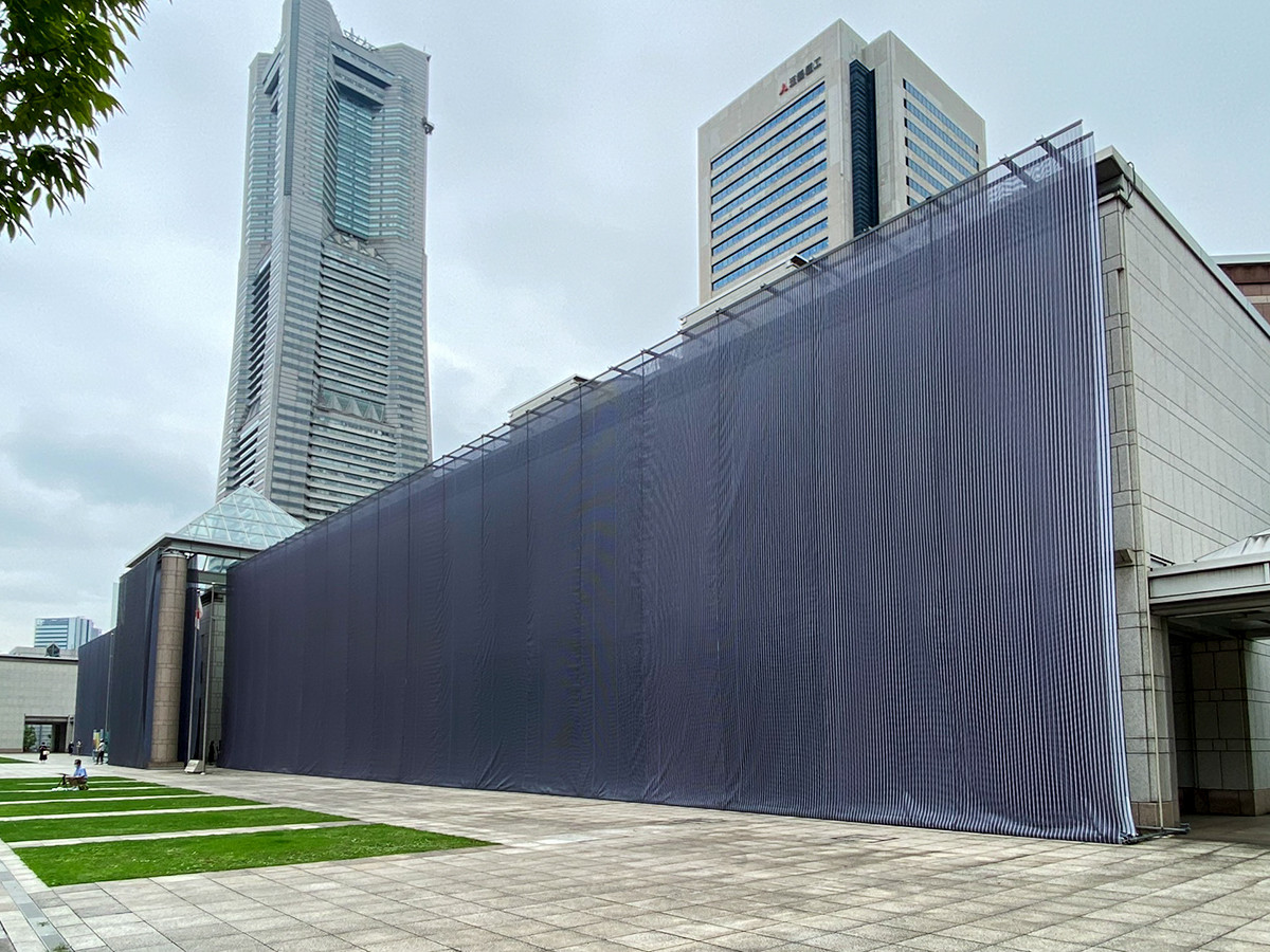 みなとみらい駅から横浜美術館に向かうとビックリ、建物の正面がストライプの布で覆われています。もちろん、改修工事が行われているわけではなく、これも作品です。