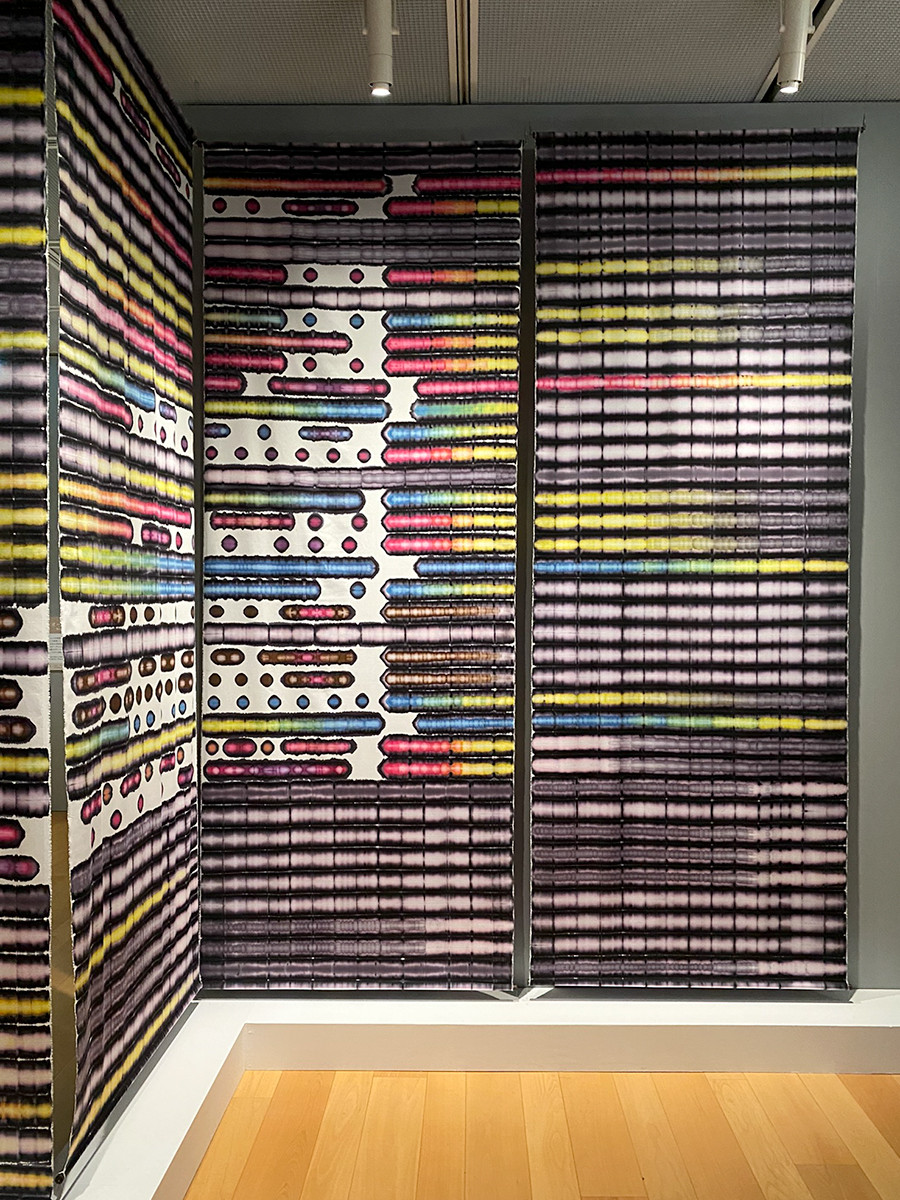 安達大悟(1985-)は染織。鮮やかな発色はまるでインクジェットプリントのようですが、折り畳んだ布を板に挟んで染める、板締め絞りで作られたもの。独特のにじみも特徴的です。