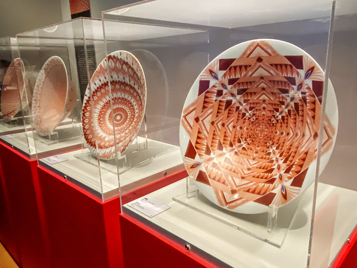 見附正康(1975-)が手がけたのが、展覧会メインビジュアルになっている加賀赤絵の大皿。実に細かな幾何学文様ですが、何とすべて手で描いています。