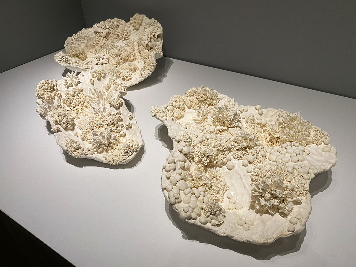 佐合道子(1984-)は、有機的な陶芸作品。鋳込み成形を用いています。海辺のいきものを連想させるような形態と独特の質感は、白一色にもかかわらず、とても艶めかしく感じられます。