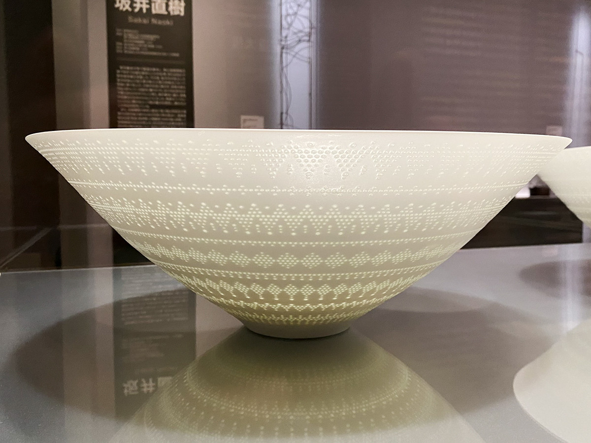 新里明士(1977-)は、透光性のある文様が施された磁器、蛍手(ほたるで)で、大口径の器を制作。横から見ると、上部からの光を受けて、精緻な文様が浮かび上がります。