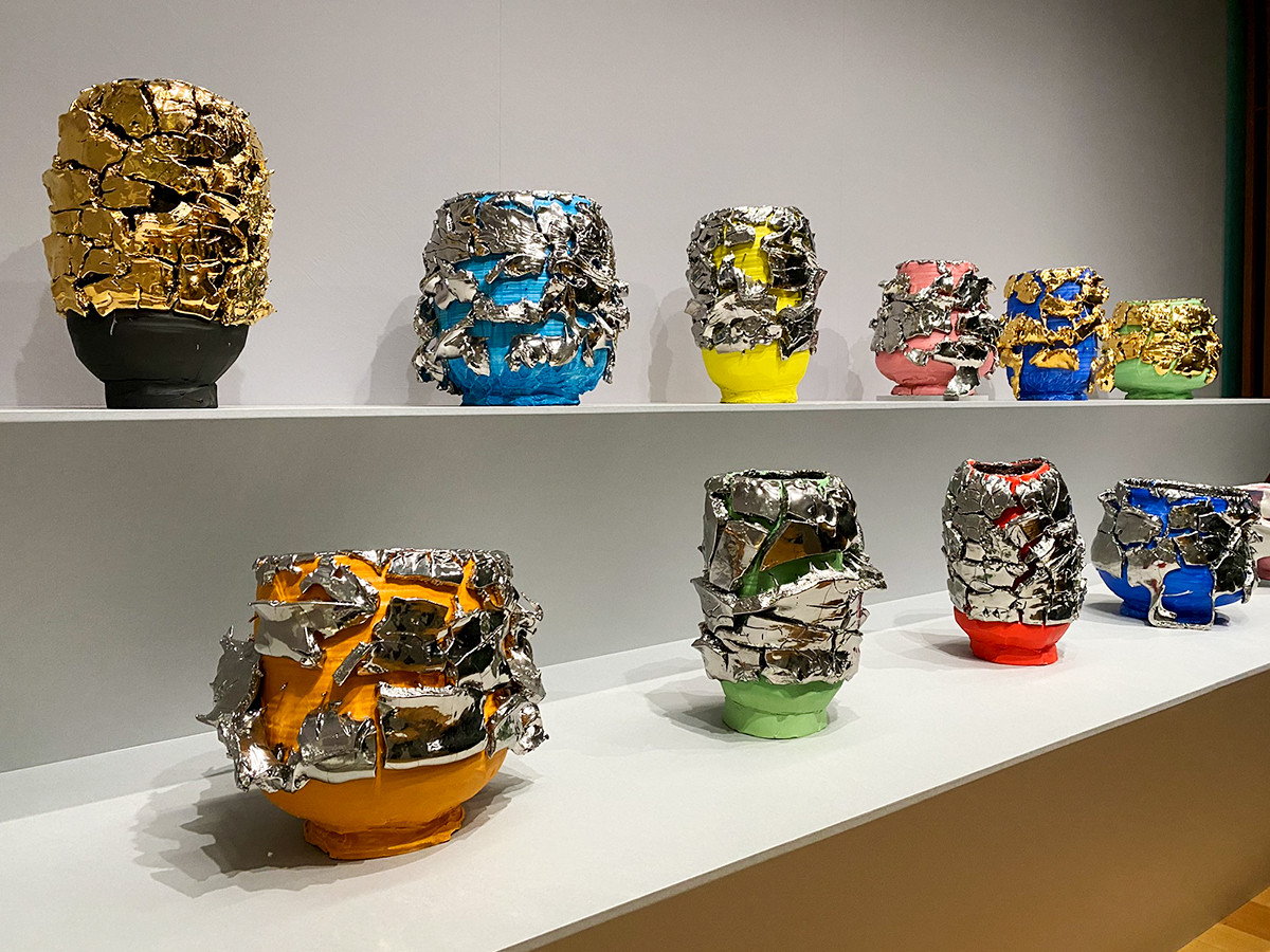 桑田卓郎(1981-)の作品は、ポップな色彩の陶器。粒状になった釉薬の縮れである梅華皮(かいらぎ)を現代風に用い、大胆な造形を生み出しています。