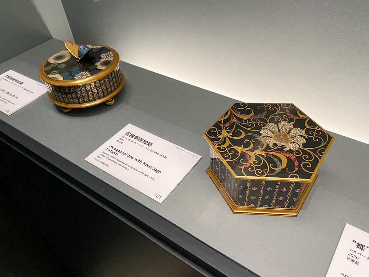 橋本千毅(1972-)は漆工芸。金属の薄板を文様に切って漆面に貼りつけ、その上から漆を塗って研ぎ出す平文(ひょうもん)により、美しい花模様が表現されています。