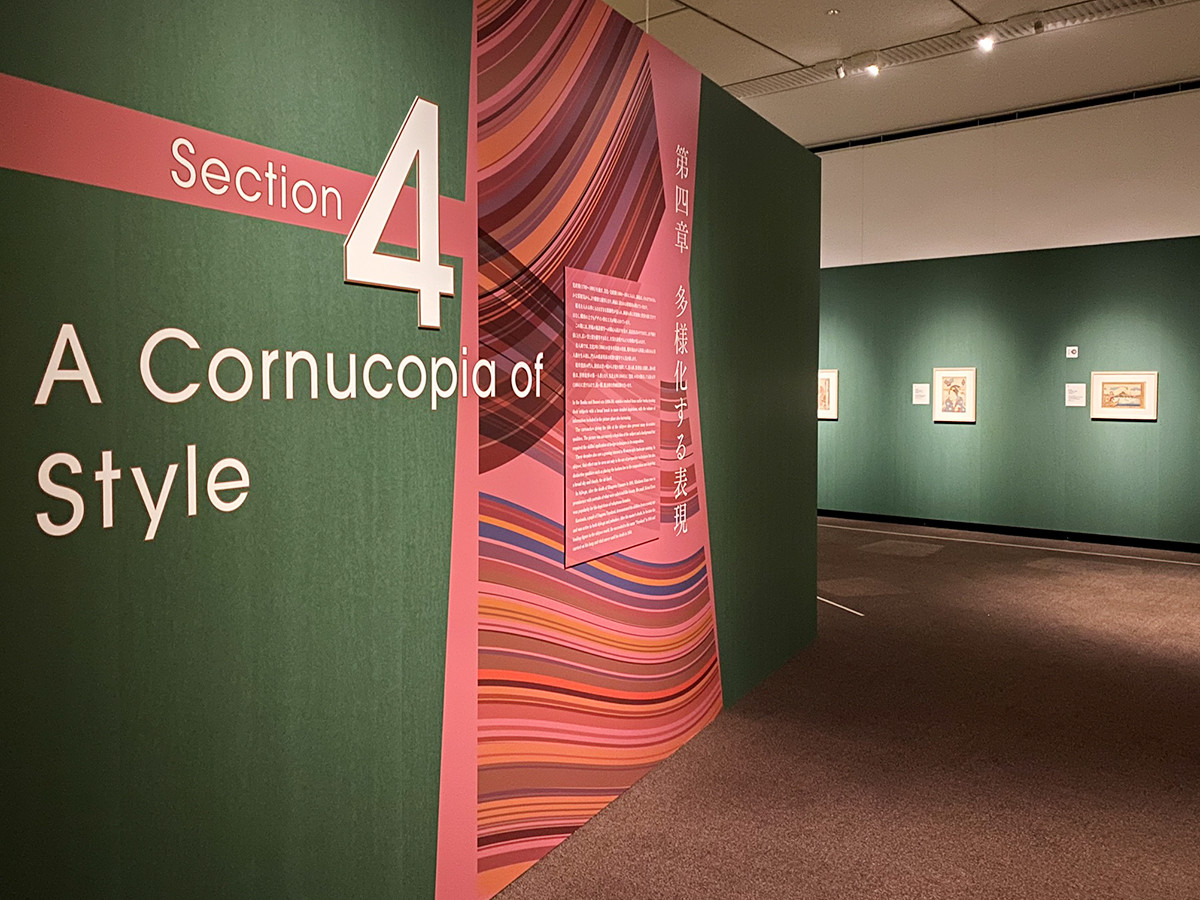 動画をご覧いただけばわかるように、会場はかなり特徴的な構成。時代ごとの章立てとは別に「精緻な摺物」と「団扇絵さまざま」が特集的な展示として紹介されており、迷路のような動線を浮世絵に包まれるように進んで行く事になります。