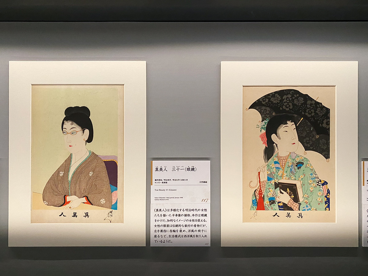 第1章2節は「装い:美人画と着物」。美人画には当時の最先端のファッションが描かれており、江戸時代の小袖から開国以降の洋装まで、流行の変遷が見て取れます。