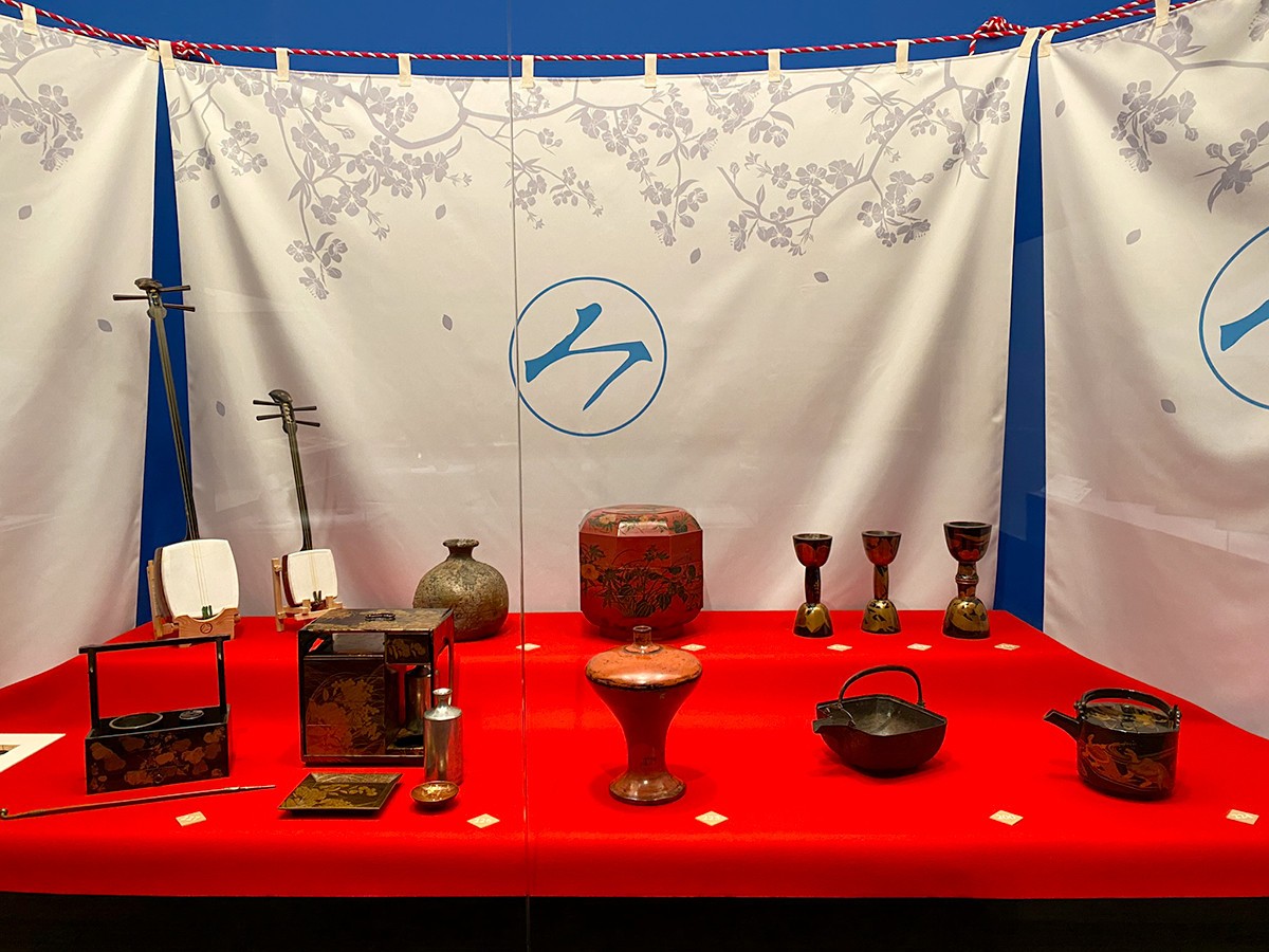 会場の一角では《上野花見歌舞伎図屏風》に描かれた酒宴の再現も。お酒や食事の道具だけでなく、三味や小鼓などの楽器も展示されています。