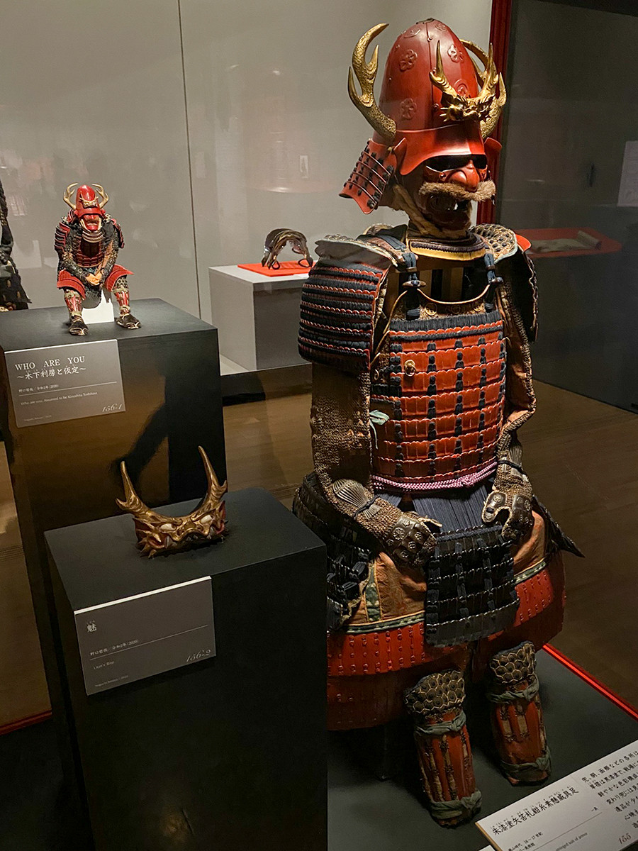 この甲冑をモチーフにした《WHO ARE YOU~木下利房と仮定~》は、野口哲哉さんの作品です。野口さんは甲冑の調査から、秀次よりも半世紀ほど後の甲冑と推測しました。どことなく生活感があふれる、野口さんならではミニチュア武将です。