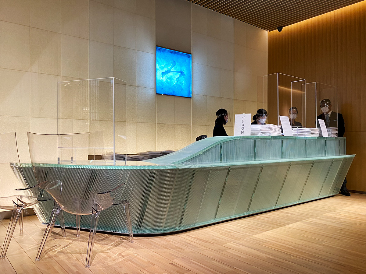 大きく変わったところは、エントランス。カウンターは水をイメージしたガラス製になり、以前は木だったカウンター背面も和紙になりました。美術館を設計した隈研吾建築都市設計事務所が監修しています。