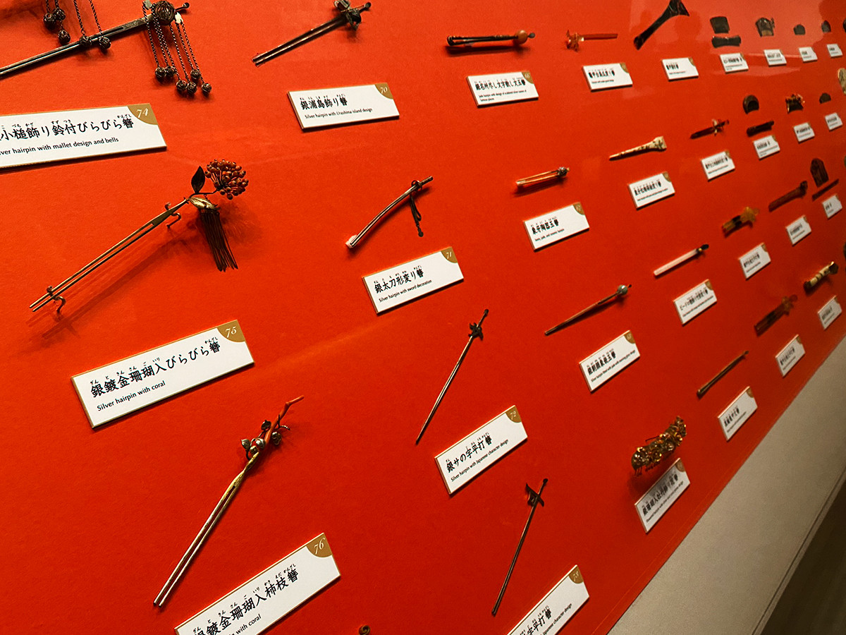 とても目を引くのが櫛、簪、笄が並ぶ一角。平面が多い櫛には絵画的な意匠が、簪や笄はかたちそのものに工夫が見られます。