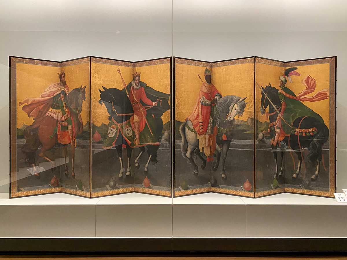 第3章1節は「異国趣味:南蛮屛風と初期洋風画」。サントリー美術館のコレクションの柱の一つである南蛮美術。重要文化財《泰西王侯騎馬図屛風》は、日本人が西洋の画法で描いた作品です。
