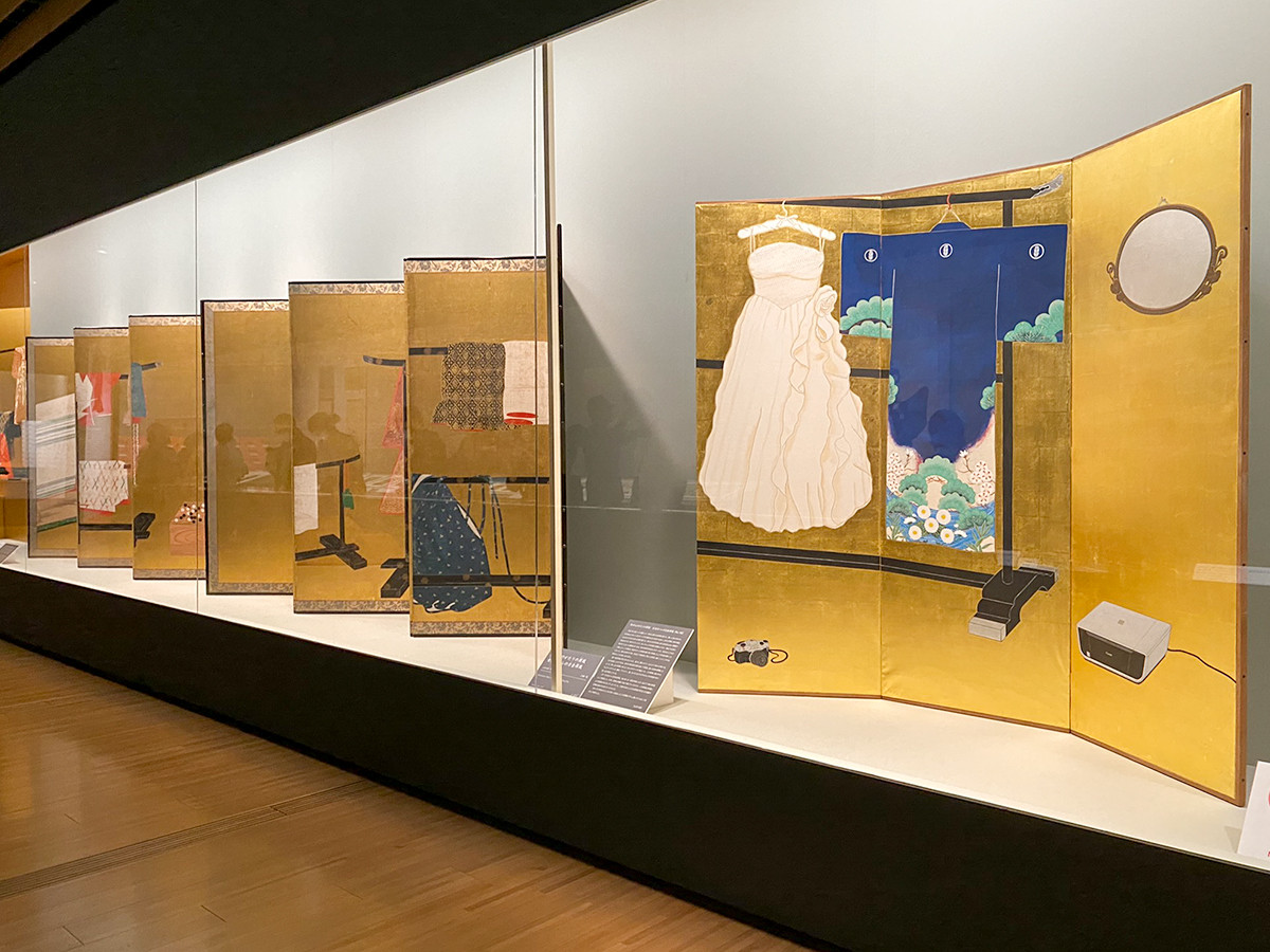 描かれた衣装や小物から、持ち主の姿を想像する「誰が袖図屛風」。館蔵の《誰が袖図屛風》には能装束や能面を入れる箱が描かれているのに対し、山本太郎さんが描いた平成の《誰ヶ裾屛風》には、エレキギターやCDラジカセが並びます。