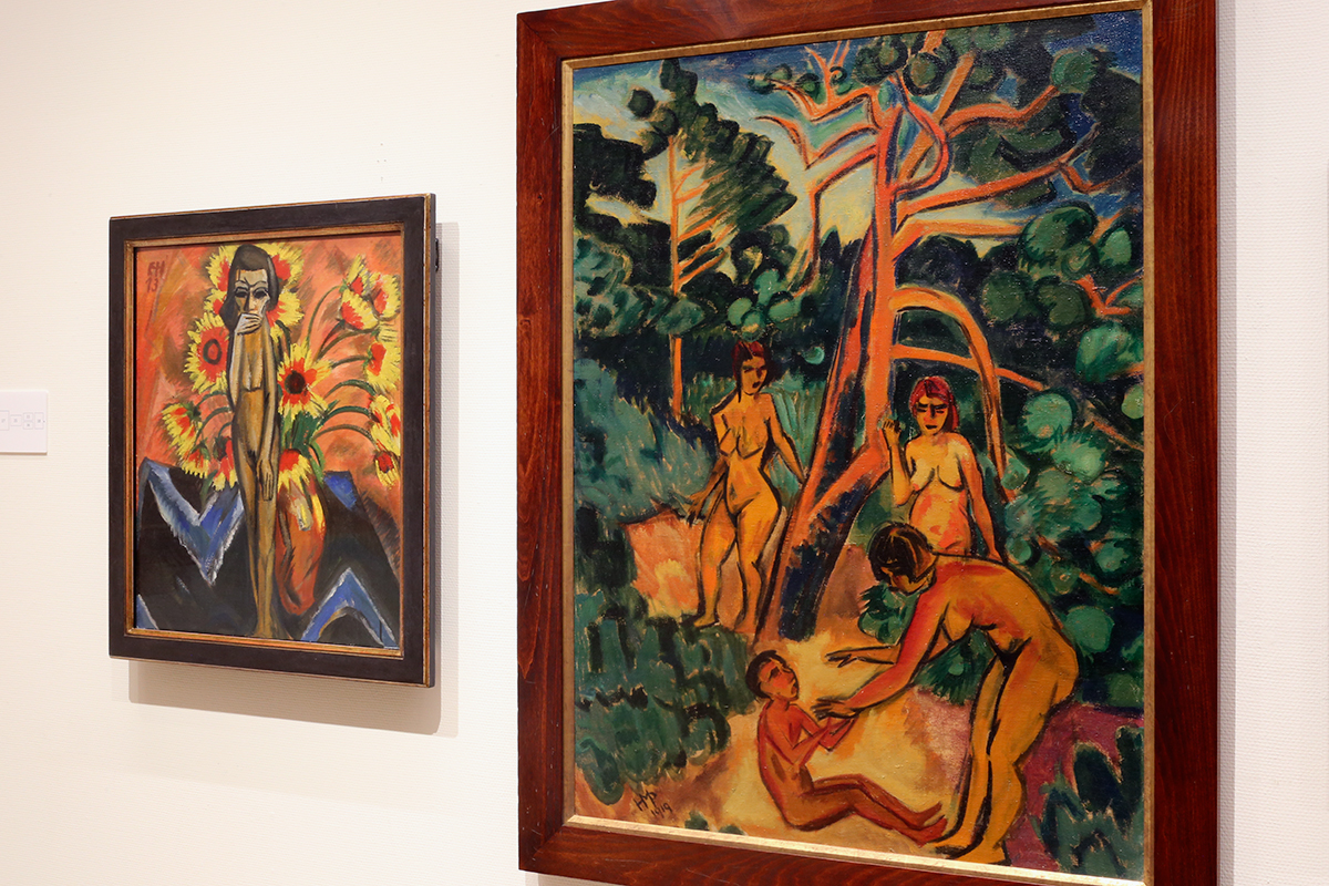 (左から)エーリヒ・ヘッケル《木彫りのある静物》1913年 広島県立美術館 / マックス・ベヒシュタイン《森で》1919年 高知県立美術館