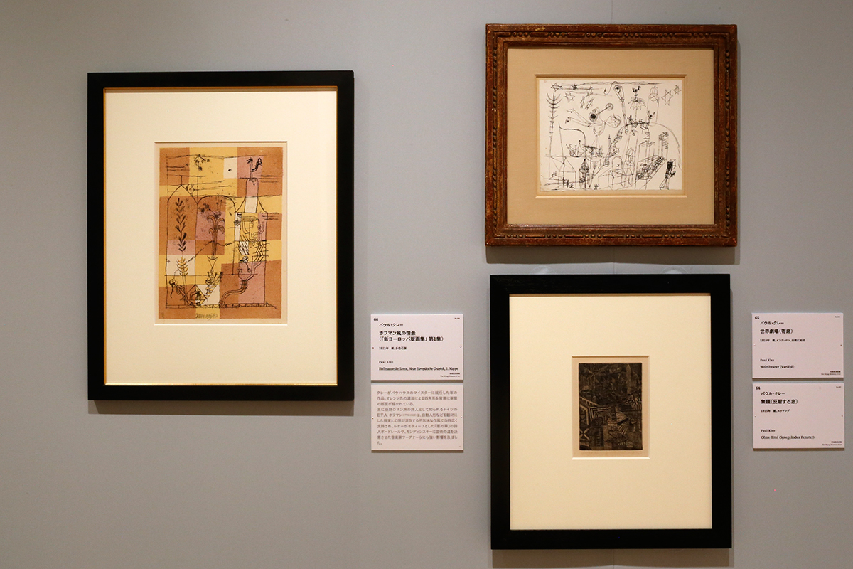 (左端から時計回りで)パウル・クレー《ホフマン風の情景(『新ヨーロッパ版画集』第1集)》1921年 宮城県美術館 / パウル・クレー《世界劇場(寄席)》1918年 宮城県美術館 / パウル・クレー《無題(反射する窓)》1915年 宮城県美術館