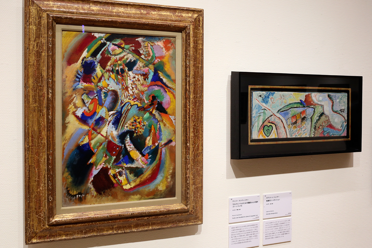 (左から)ヴァシリー・カンディンスキー《「E.R.キャンベルのための壁画No.4」の習作》1914年 宮城県美術館 / ガブリエーレ・ミュンター《抽象的コンポジション》1917年 横浜美術館