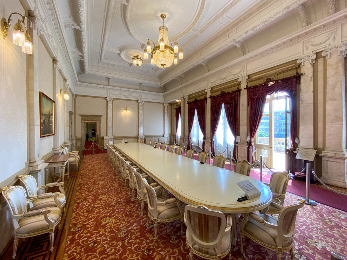 旧山形県庁舎2階の正庁は、現在でいえば講堂。豪華な家具が並ぶさまは、まるで迎賓館のようです。