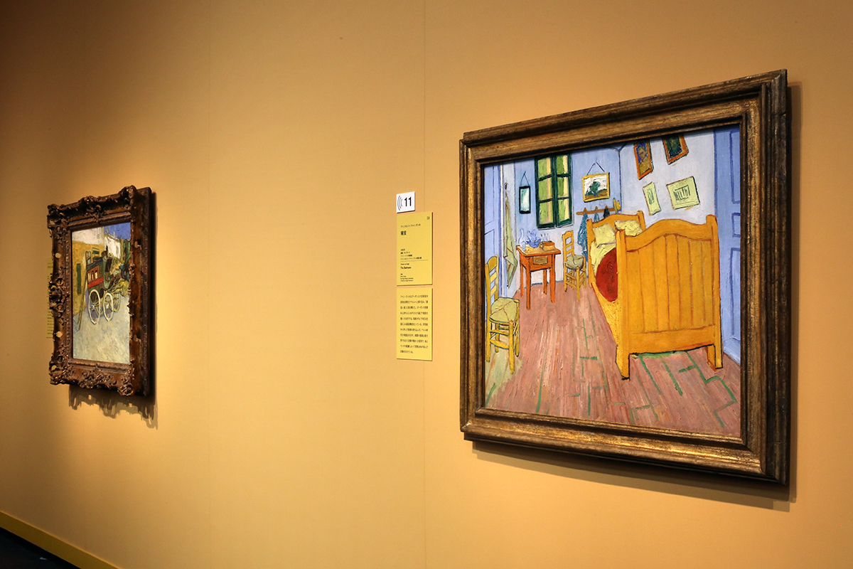 (左から)フィンセント・ファン・ゴッホ《タラスコンの乗合馬車》1888年 ヘンリー&ローズ・パールマン財団蔵(プリンストン大学美術館 長期貸与) / フィンセント・ファン・ゴッホ《寝室》1888年 ファン・ゴッホ美術館(フィンセント・ファン・ゴッホ財団)蔵