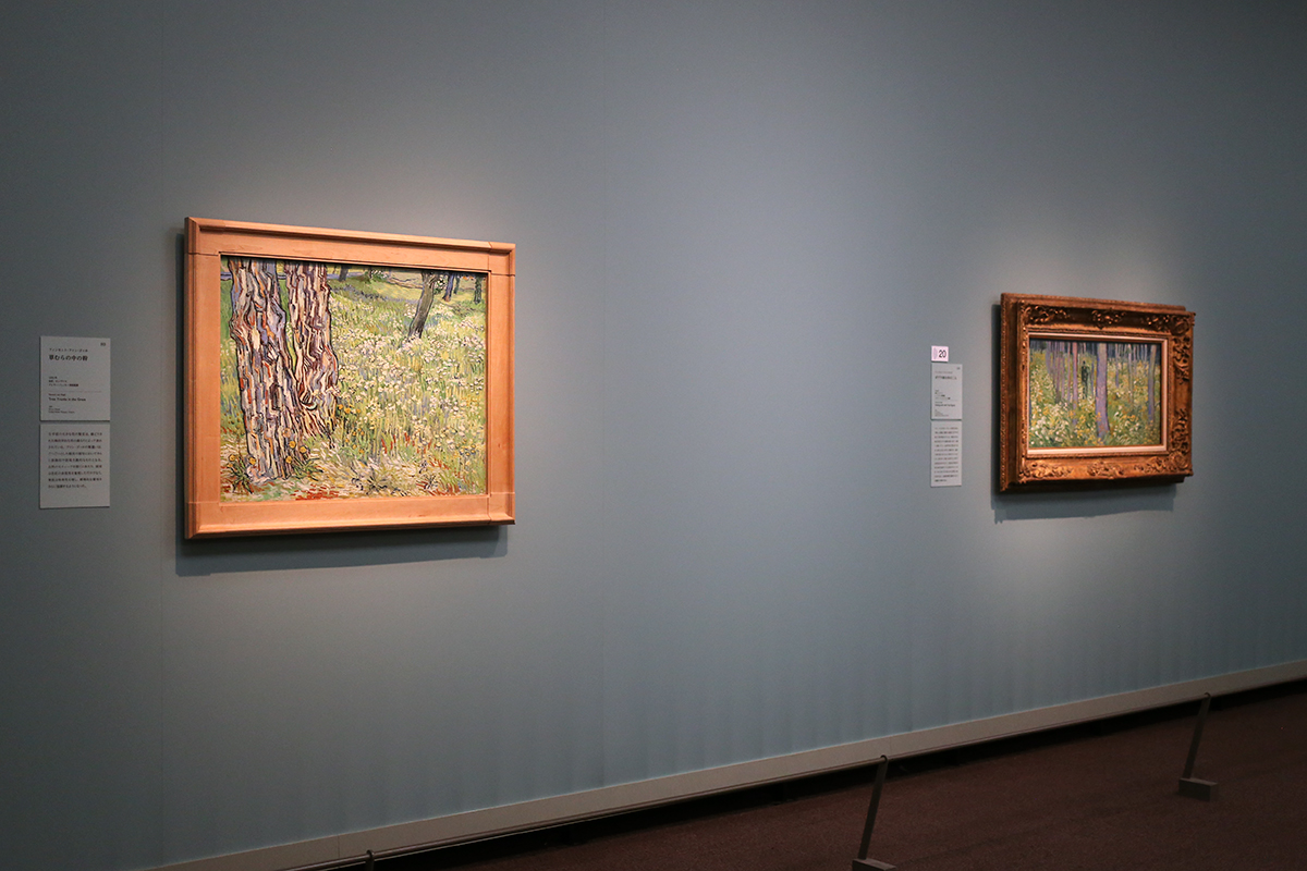 (左から)フィンセント・ファン・ゴッホ《草むらの中の幹》1890年 クレラー=ミュラー美術館蔵 / フィンセント・ファン・ゴッホ《ポプラ林の中の二人》1890年 シンシナティ美術館蔵(メアリー・E.・ジョンストン遺贈)