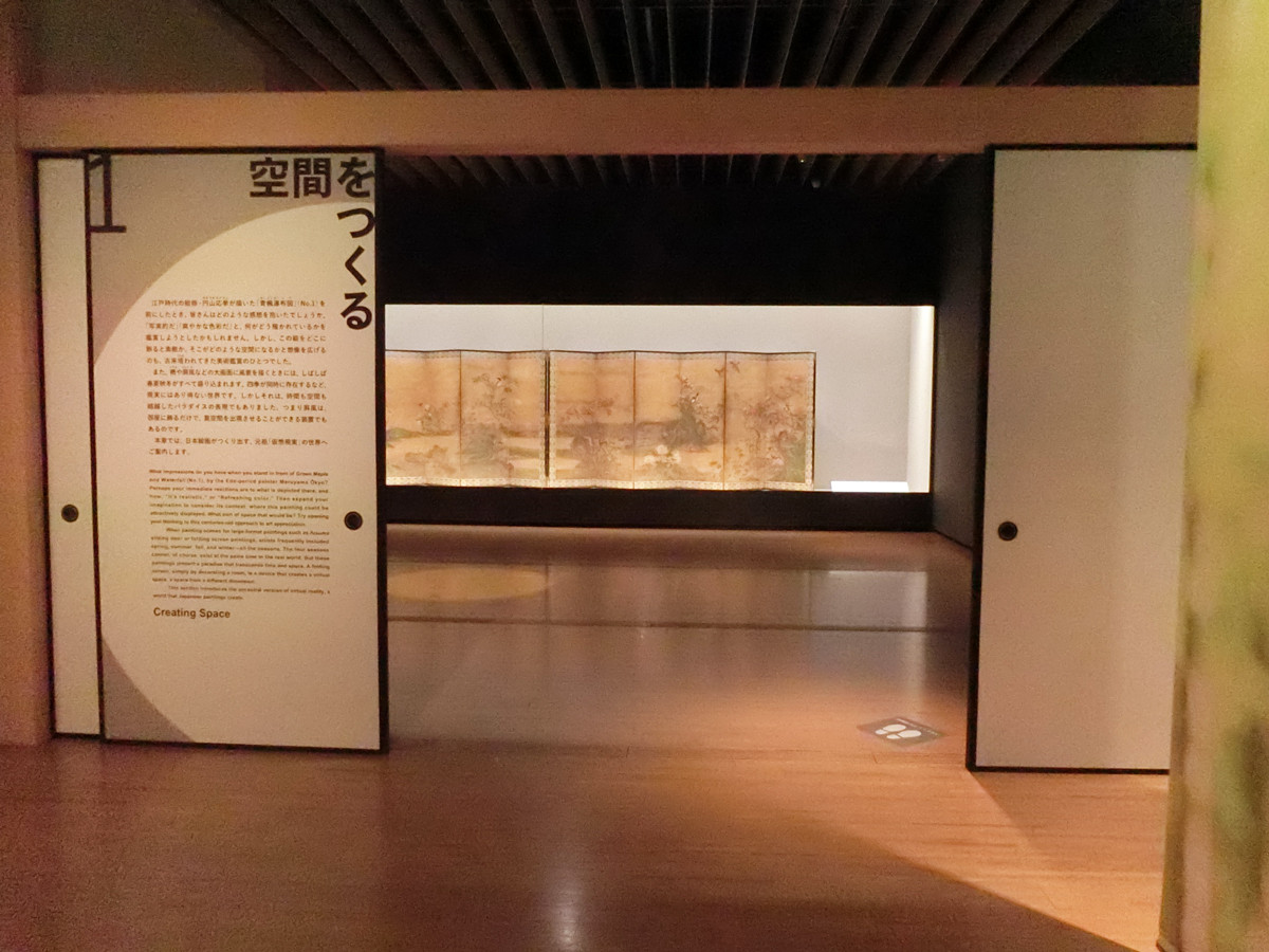 昔は、障子や襖、床の間がありました。今は、ほとんどありません。 では、昔はどう飾っていたのでしょう。 それをイメージできる空間づくりがされています。襖を通ると屏風が登場。