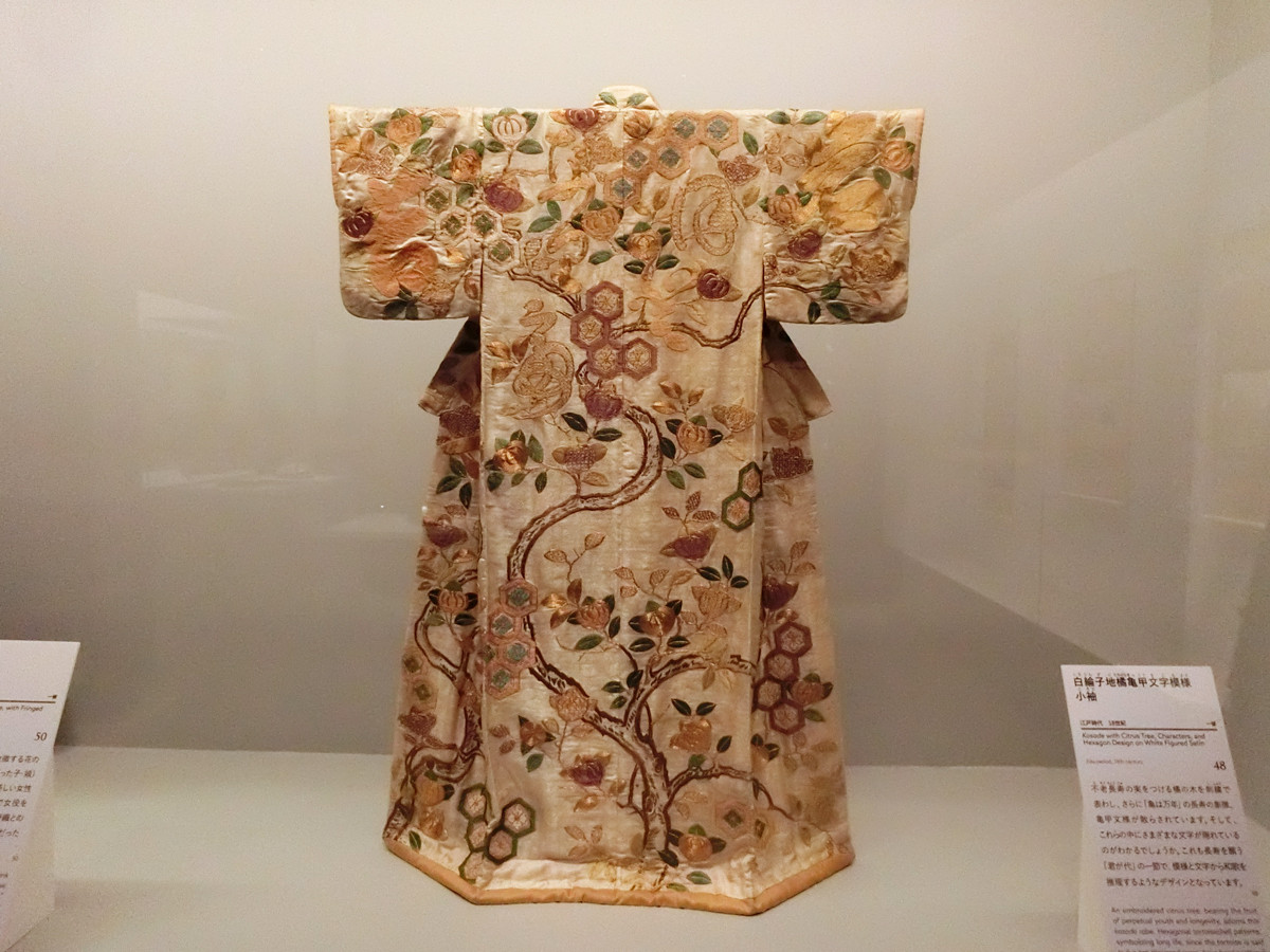 白綸子地橘亀甲文字模様小袖 一領 江戸時代 18世紀 サントリー美術館 【展示期間:9/30~10/26】