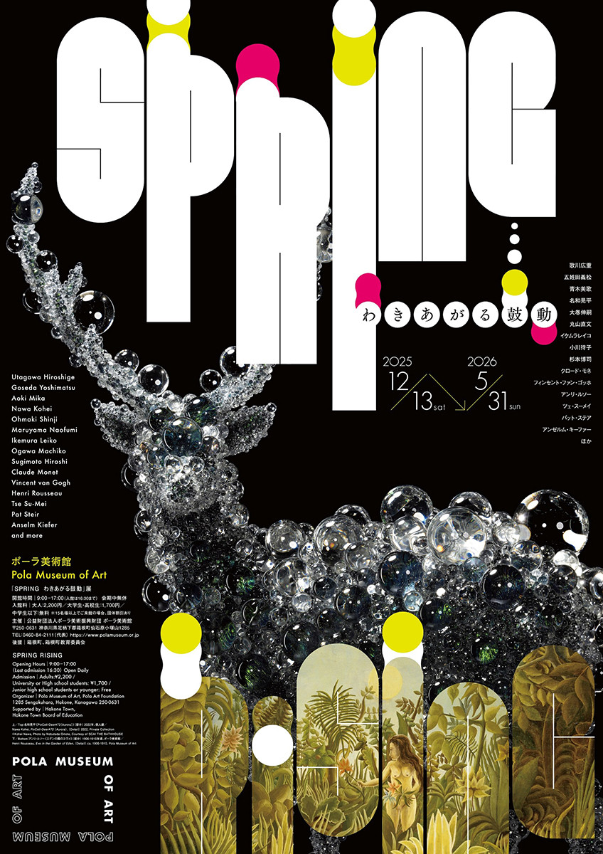 ポーラ美術館「SPRING わきあがる鼓動」では、春の芽吹きのようにわきあがる生命や創造の力をテーマに、絵画、彫刻、工芸、インスタレーション作品を紹介。見どころは、大巻伸嗣によるインスタレーションや、現代美術家・杉本博司や陶芸家・小川待子による新作。箱根の風土と記憶を出発点に、過去から未来へとつながる想像の旅を誘います。