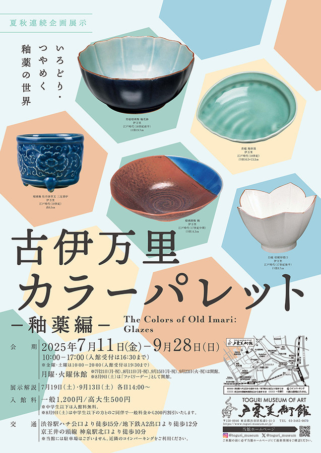 戸栗美術館では、夏~秋にかけて「古伊万里カラーパレット」を開催。7月11日から開催される「釉薬編」では、透明釉や青磁釉、瑠璃釉、銹釉などの多彩な釉薬表現に注目し、古伊万里約80点を紹介します。白い磁肌に映える色鮮やかな絵付けの美しさに注目した秋開催の「絵具編」(10/10~12/21)と合わせての鑑賞もおすすめです。