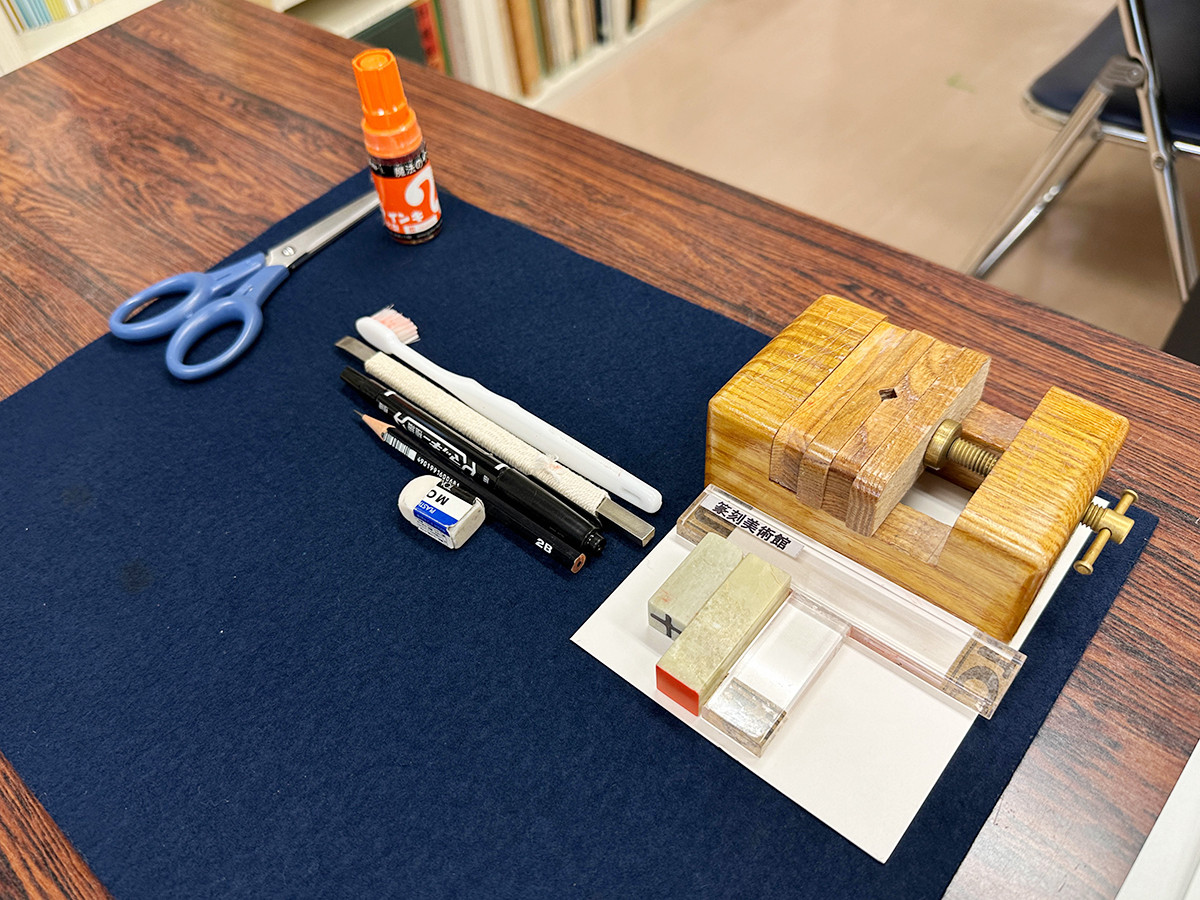 まずは、その書体を見ながら鉛筆で印稿(印を彫る前の下書き)を作成。制作に必要な道具は、すべて美術館が用意してくれます。